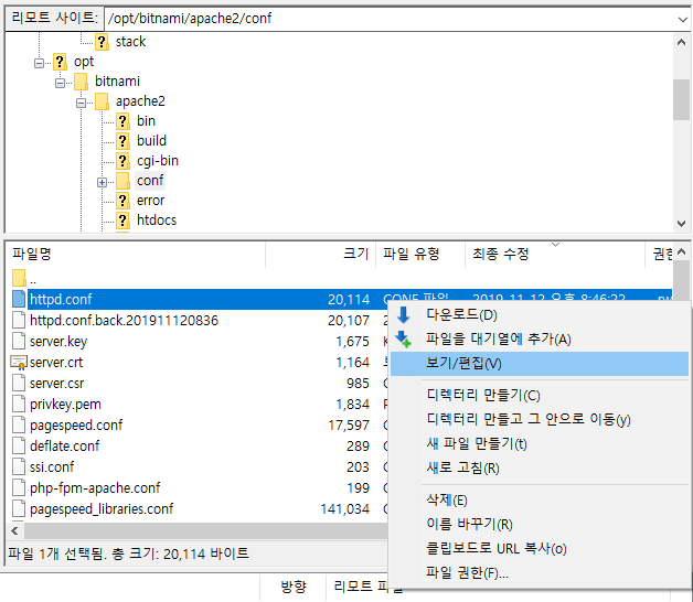 FTP로 접속해서 /opt/bitnami/apache2/conf/httpd.conf 파일을 편집합니다.