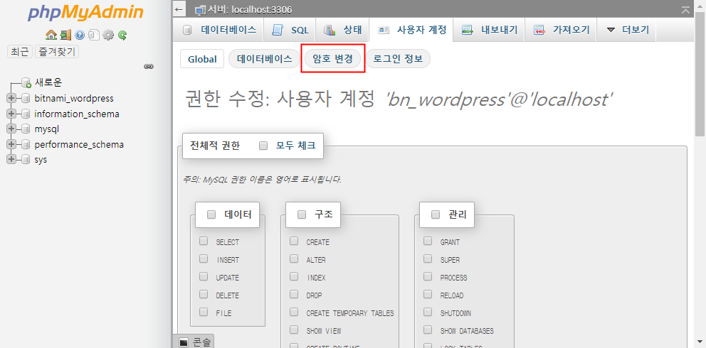 - bn_wordpress@localhost의 권한 수정을 클릭합니다.