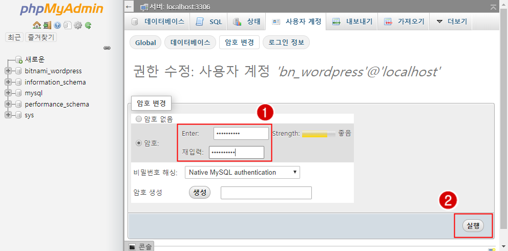 - 아래와 같이 bn-wordpress@localhost에 대한 권한 수정 화면이 나타나면, 암호 변경을 클릭합니다.