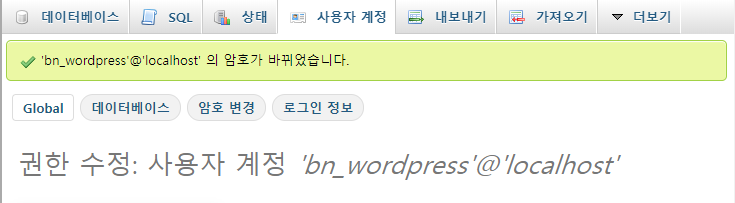 정상적인 경우 bn_wordpress@localhost의 암호가 바뀌었다고 성공 메시지가 나타납니다.