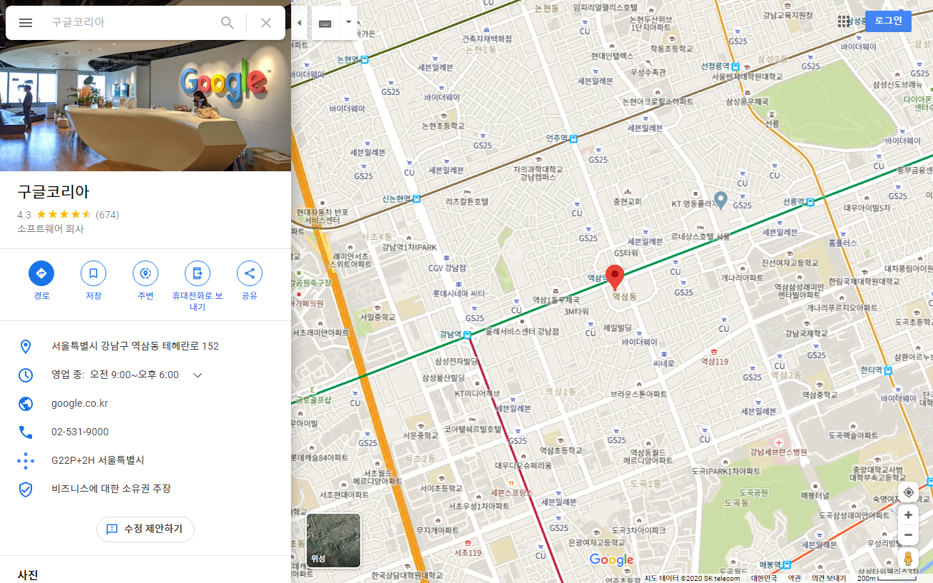 먼저 구글맵에 접속해서 원하는 장소를 검색합니다. 여기서는 구글코리아를 한번 검색해 보겠습니다. 구글코리아는 역삼동 강남파이낸스 센터에 있었군요!