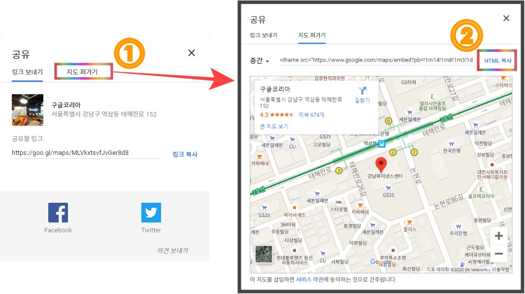 구글맵에서 지도 공유 기능을 이용하여 embed 하는 방법에 대해서 살펴보도록 하겠습니다.
