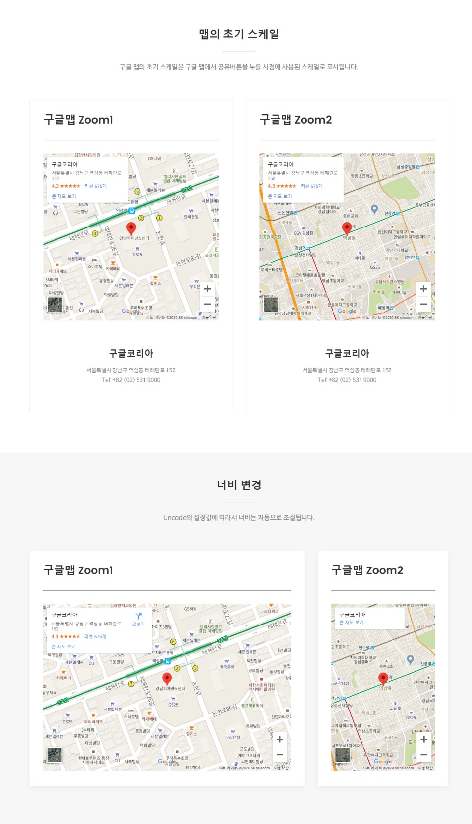 아래 구글맵이 적용된 페이지에 들어가 보시면 결과물을 확인할 수 있습니다. Uncode의 경우에 width는 자동으로 들어가고 height는 iframe 내의 속성을 변경해주면 되는 것 같습니다. 이 부분은 각자의 테마에 따라서 직접 변경해보면 쉽게 적용할 수 있을 것 같습니다.