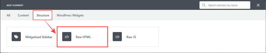 Uncode 테마에서는 페이지 빌더에서 ADD ELEMENT를 선택한 후 Structure 탭을 선택합니다. 여기서 Raw HTML을 선택하면 복사한 iframe을 넣을 수 있는 창이 생깁니다.