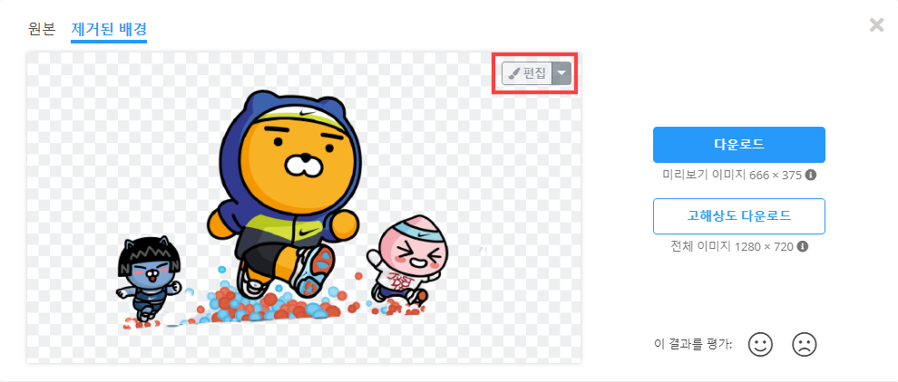 아래는 카카오프렌즈의 배경이 제거된 사진입니다. 잘 변환되었지만 밑에 흙먼지(?)와 같은 부분을 수동으로 지워보겠습니다. 변환 결과 화면에서 편집 버튼을 누릅니다.