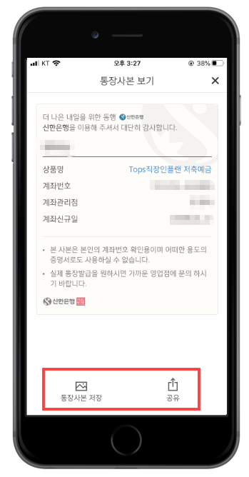 3. "통장사본 보기"를 클릭하면 아래와 같이 해당 계좌의 통장사본 보기 화면이 나타납니다. 통장사본을 이미지로 저장하거나 공유를 이용해 다른 곳으로 전송할 수 있습니다.