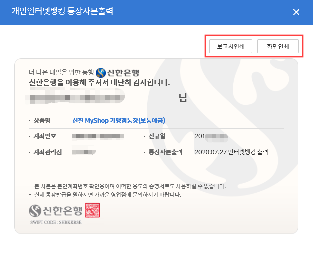 1. 웹 (신한은행 홈페이지)에서 출력하기