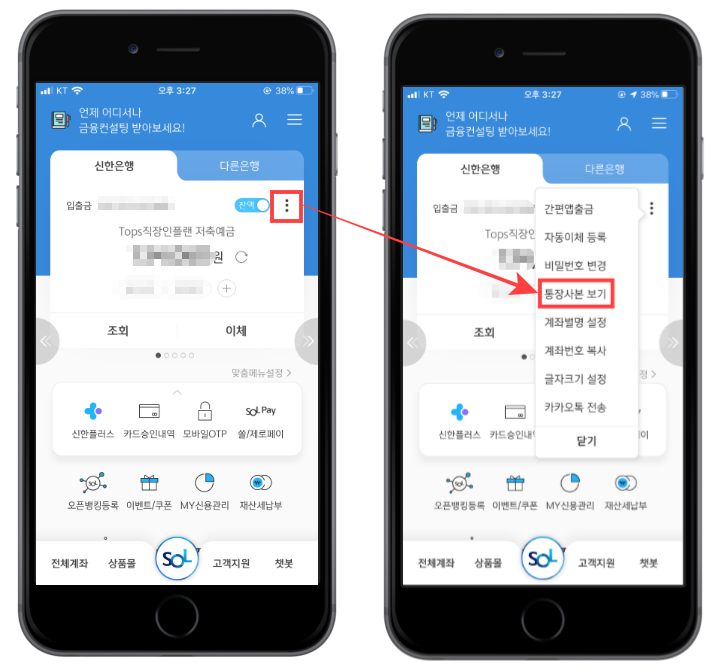 신한은행 앱 (SOL, 쏠)에서도 통장사본을 저장할 수 있습니다. 저는 아이폰을 사용하고 있어서 아이폰 기준으로 설명합니다만, 안드로이드도 마찬가지 일 것으로 생각됩니다.