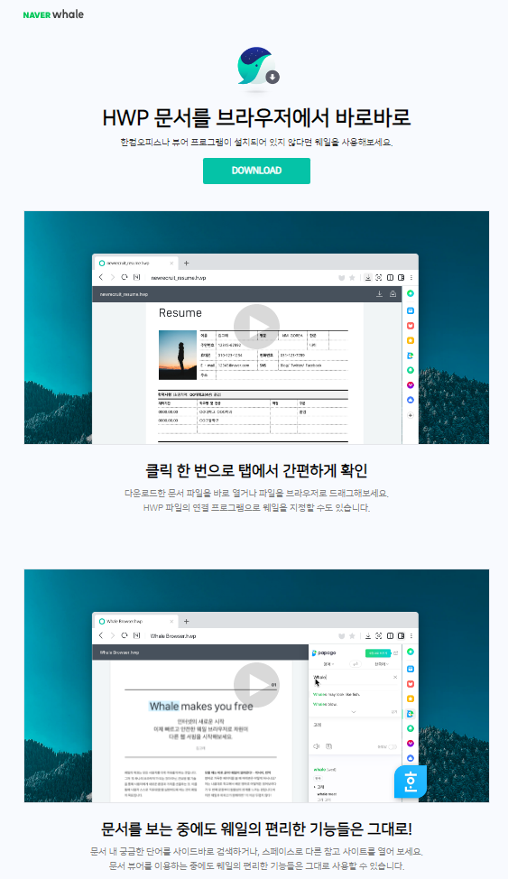 안녕하세요. 네이버 웨일 팀입니다. 최근 업데이트된 v.2.7.98.19 버전에 한글 뷰어 기능이 탑재되었습니다. 이제는 HWP 파일도 별도의 프로그램 설치 없이 브라우저에서 바로 확인하실 수 있습니다