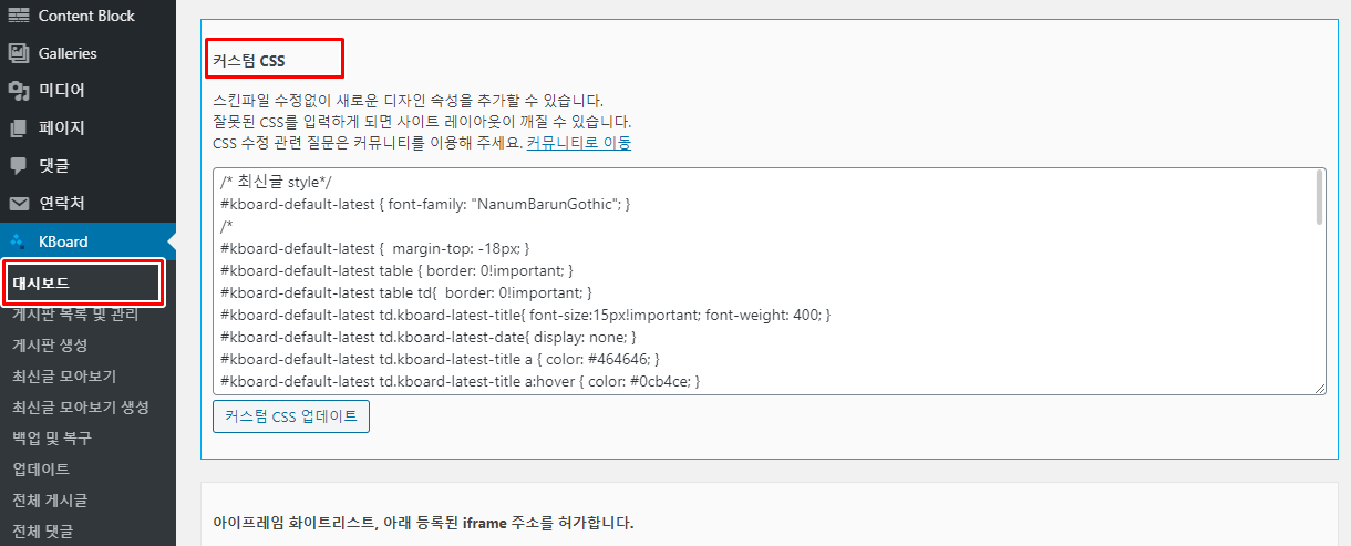 Kboard → 대시보드 메뉴로 이동한 후 스크롤하다 보면 커스텀 CSS라고 표시된 곳을 찾을 수 있습니다. 여기서 게시판의 CSS를 설정할 수 있습니다. 여기서 게시판 리스트, 게시판 내용 등의 KBoard관련 CSS를 변경할 수 있습니다.