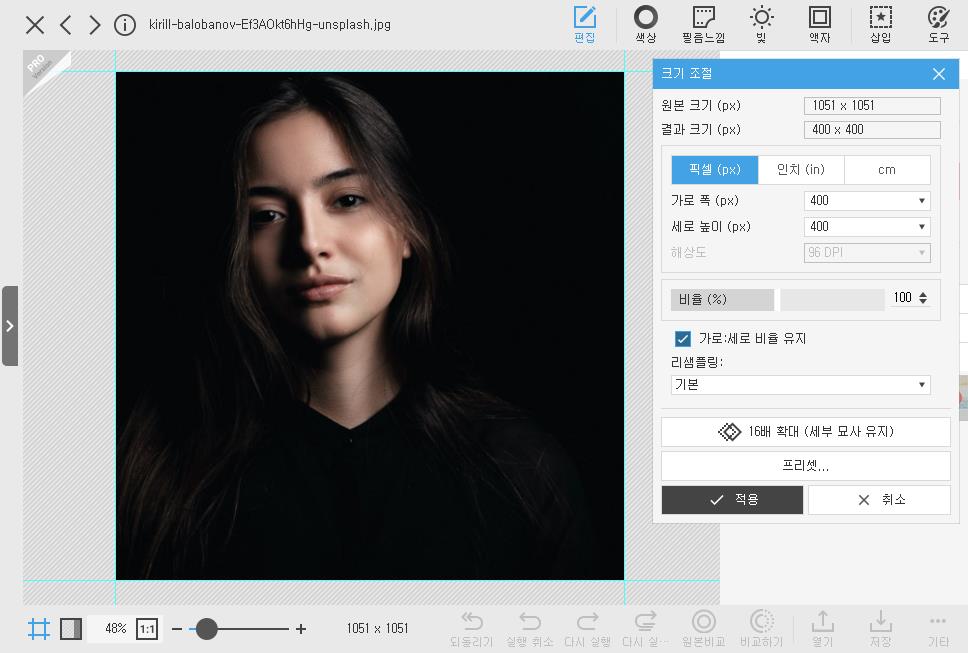 다음으로 이미지의 크기를 최종 썸네일의 크기(400 x 400)로 변경합니다.