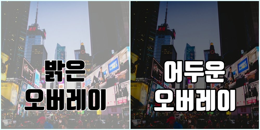 좌측은 밝은 오버레이에 어두운 글씨, 우측은 어두운 오버레이에 밝은 글씨를 설정한 것입니다. 이미지 위에 바로 텍스트를 입히는 것보다 레이어를 추가함으로써 텍스트가 명확하게 보이는 것을 알 수 있습니다.