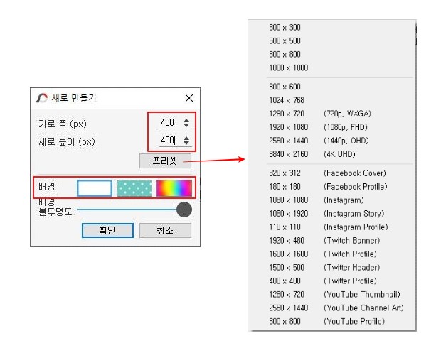 새로 만들기를 클릭하면 아래와 같은 "새로 만들기" 창이 나타납니다. 여기서 원하는 썸네일의 크기를 지정한 후, 배경의 색상 (혹은 모양)을 선택해줍니다. 참고로 프리셋을 이용하여 미리 설정된 사이즈를 선택할 수 있습니다. (다양한 프리셋이 존재하네요!)