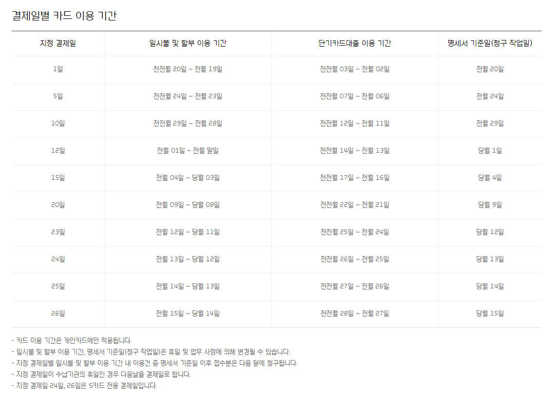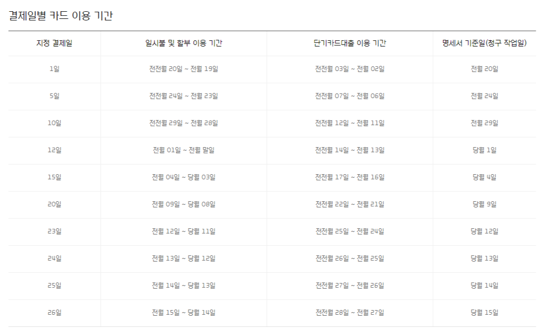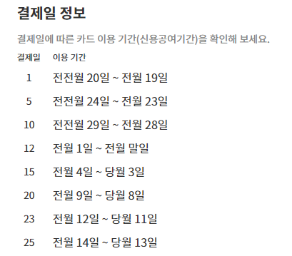 그러면 아래와 같이 결제일별 카드 이용 기간이 나타납니다.