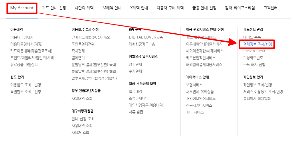 결제일의 변경은 다음과 같이 "My Account ▷ 카드정보관리 ▷ 결제정보 조회/변경"에서 할 수 있습니다. 물론 로그인은 한 상태여야겠죠?