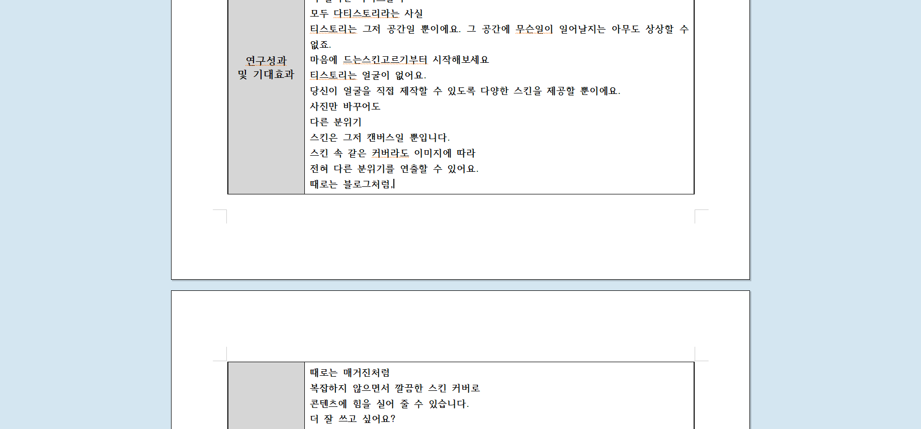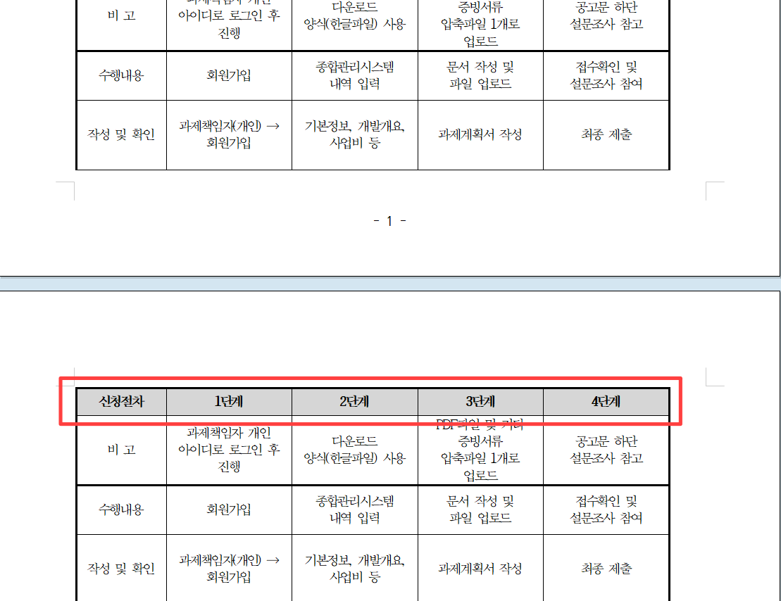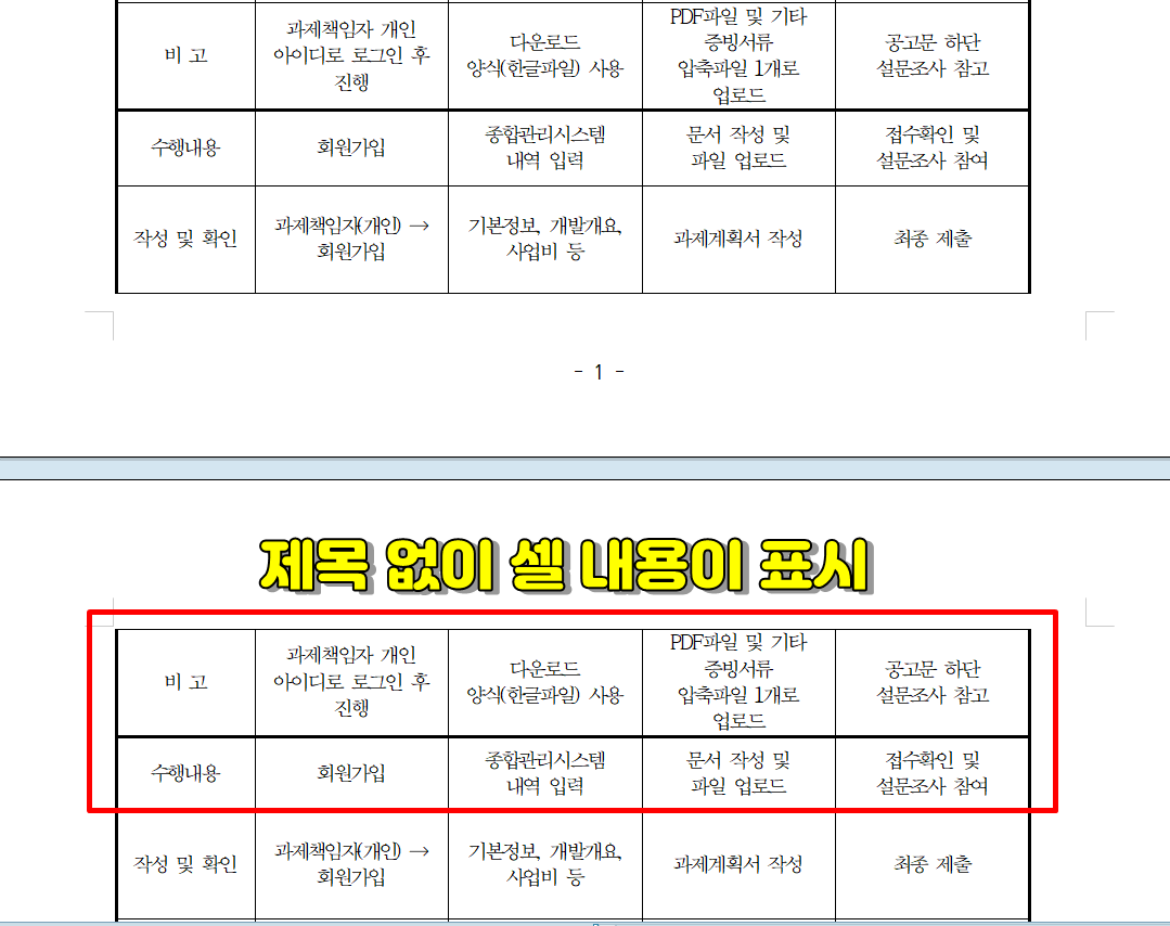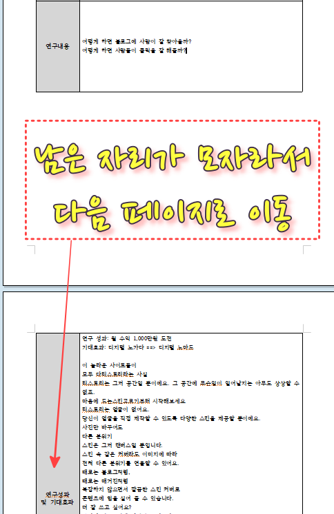 이 경우, 아래 그림처럼 "연구성과 및 기대효과"라는 열은 첫 페이지에 들어가기에는 남은 자리가 모자라서 다음 페이지로 이동되었습니다. 물론, 첫 페이지의 빈 부분은 여백 상태로 남아있게 됩니다. 이와 같이 "셀 단위로 나눔"을 선택하면 각 셀은 한 페이지 내에서 표시되게 됩니다.