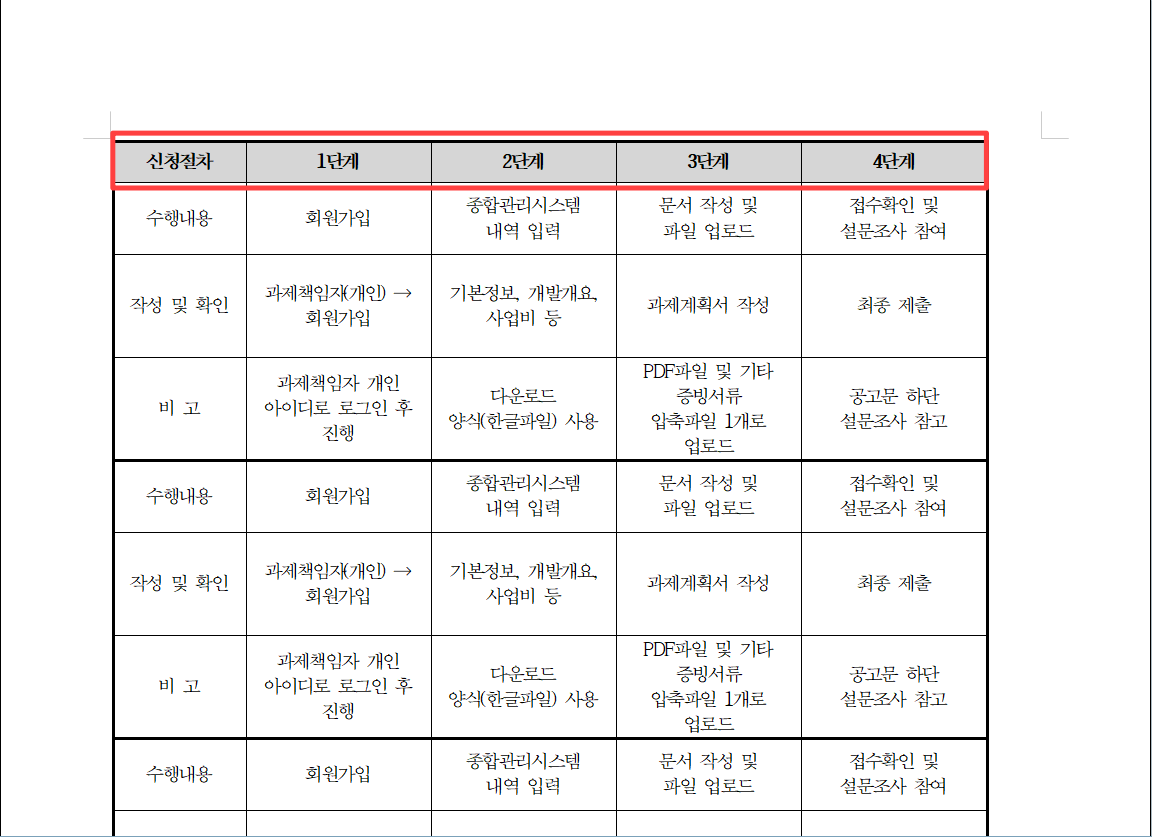 표가 몇 페이지에 걸쳐 이어져 있다면 이런 식으로 제목 셀이 반복되도록 설정하는것이 가독성을 높이는데 매우 좋습니다. 직접 손으로 표를 나누고 제목행을 계속 입력하는 것보다, 이 방법을 이용하면 훨씬 간편하게 설정할 수 있습니다.