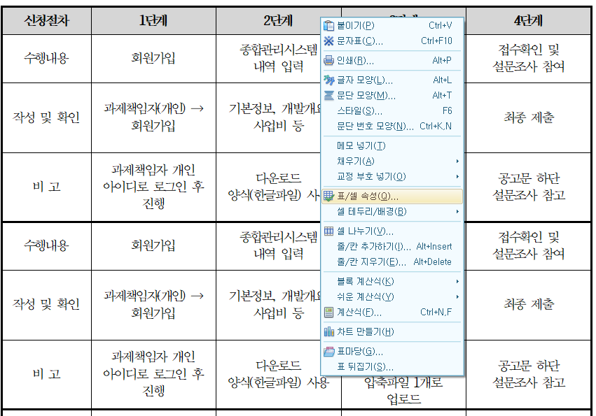 - 표 내의 아무 셀에서 우클릭 --> 표/셀 속성을 선택