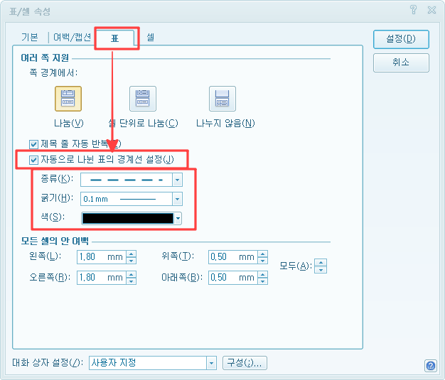 여기서 아래와 같이 "자동으로 나뉜 표의 경계선 설정"을 체크하고 선의 종류와 굵기, 색상 등을 변경하고 설정을 클릭하면 됩니다.