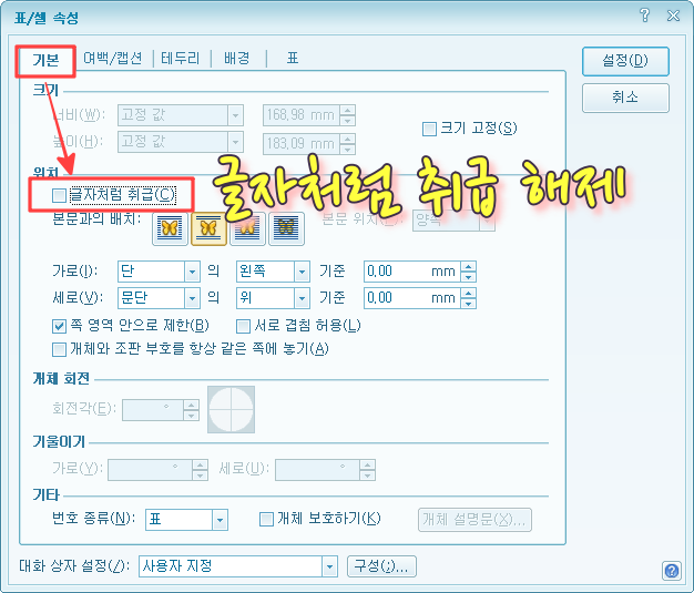 그러면 아래처럼 "글자처럼 취급"에 체크가 되어 있을 텐데요, 체크를 해제하고 설정을 눌러줍니다.