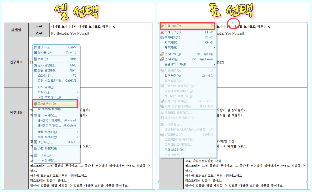 제목 줄 자동 반복을 체크했으니, 이제 제목으로 사용할 행을 결정하면 됩니다. 대부분 첫 행이 제목일테니, 첫 페이지 제목 행의 아무 셀에서 우클릭하고 표/셀 속성을 선택합니다.