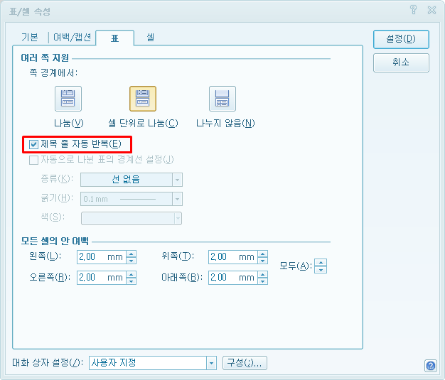 동일한 셀을 여러 페이지에 나눠서 찍기 싫은 경우도 있겠죠? 즉, 하나의 셀이 여러 페이지에 걸치지 않기를 원하는 경우도 있을 텐데요, 이 경우에는 표/셀 속성의 표 탭에서 "나눔" 대신에 "셀 단위로 나눔"을 선택하고 설정을 누릅니다.