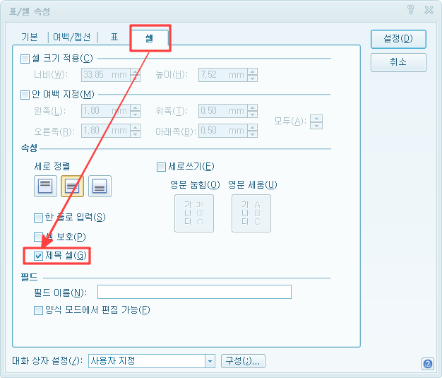 셀 탭에서 아래쪽 속성을 보시면 "제목 셀"이란 곳이 보이는데요 여기를 체크해줍니다.