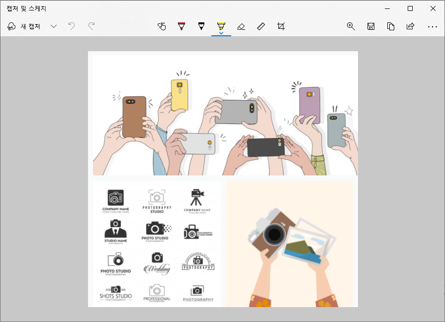 해당 알람을 클릭하면 아래와 같이 "캡처 및 스케치" 어플이 실행되고, 방금 캡처한 그림이 나타납니다. 여기서 간단한 편집과 저장이 가능합니다.