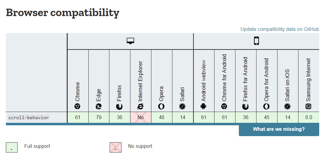 사실상 단종 단계인 Internet Explorer를 제외하고는 거의 모든 브라우저에서 scroll-behavior 속성을 제공하는 것으로 되어 있습니다.