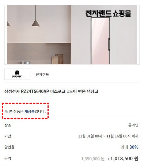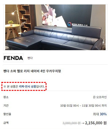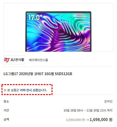 리퍼, 전시 상품의 경우, 상품 페이지에 들어가 보면 "※ 본 상품은 리퍼·전시 상품입니다"라고 표시되어 있습니다.