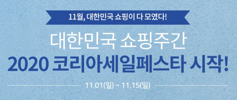 2020 코리아세일페스타가 11월 1일 ~ 11월 15일 기간 동안 진행됩니다.