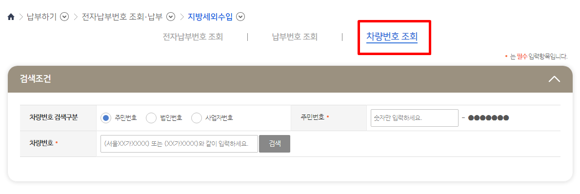 해당 메뉴를 클릭하면 아래와 같은 화면이 나오는데, 여기서 "차량번호 조회"를 선택하고 주민번호와 차량번호를 입력하면 주정차 위반 과태료 조회가 가능합니다.