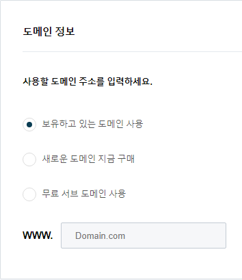 다음으로 도메인 주소를 입력합니다. 앞에서 도메인을 구입했으므로 "보유하고 있는 도메인 사용"을 선택합니다.