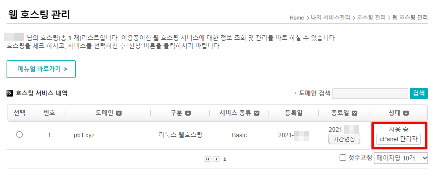 호스팅 서비스 내역에 방금 만든 리눅스 웹호스팅이 추가되었습니다. 우측에 보면 "cPanel 관리자" 버튼이 있습니다. cPanel에는 이 버튼으로만 들어갈 수 있습니다.