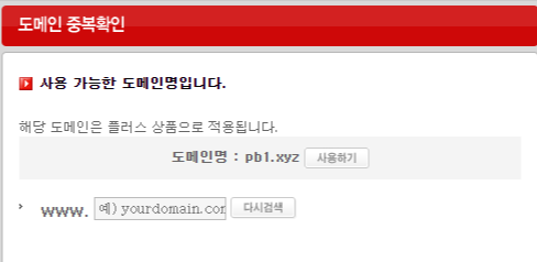 그러면 아래와 같이 도메인 중복확인 창이 나타납니다. 여기에 구입한 도메인(여기서는 pb1.xyz)을 입력하고 "검색"버튼을 눌러줍니다. 그러면 2번째 그림과 같은 화면이 나오게 되고 여기서 사용하기를 클릭하면 됩니다.