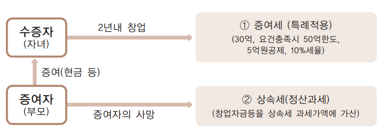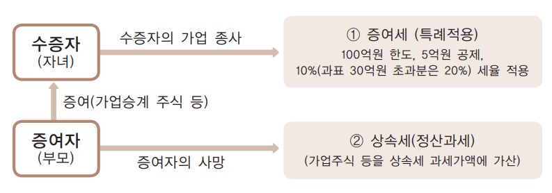 - 증여세율 : 10% (30억원 한도, 10명이상 신규 고용 시 50억원 한도)