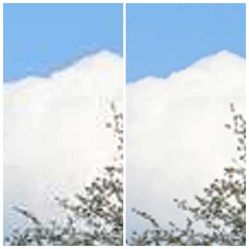 구름 부분을 확대해서 보면 저장 품질을 50으로 압축한 경우, 특히 하늘-구름-나무의 경계선 부분에서 이미지 품질이 확연하게 떨어져 있는 것을 확인할 수 있습니다.