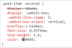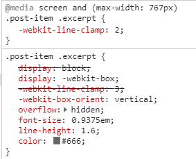 뭔가 새로운 항목이 보지요? 바로 "-webkit-line-clamp"입니다. 해당 속성에 값을 적용함으로써 임의의 수로 텍스트 라인을 조절할 수 있습니다.