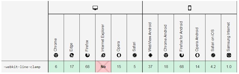 -webkit-line-clamp는 IE를 제외한 대부분의 브라우저에서 지원을 하므로, 특별히 IE를 꼭 지원해야 하는 경우가 아니라면 큰 부담 없이 사용해도 될 것 같습니다.