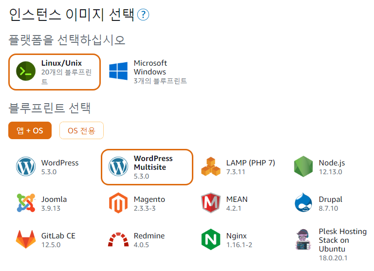 대학, 기업, 기관과 상관없지만 서브도메인을 생성할 예정이므로 워드프레스 멀티사이트 블루프린트를 선택하여 인스턴스를 생성하겠습니다.