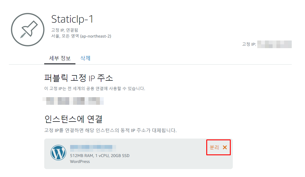 기존의 인스턴스에서 고정 IP를 분리하기 위해서 라이트세일 대시보드 홈 화면에서 네트워킹 메뉴로 들어갑니다. 여기서 연결하려는 고정 IP 이름을 클릭하면 아래와 같이 분리할 수 있는 화면이 나타납니다.