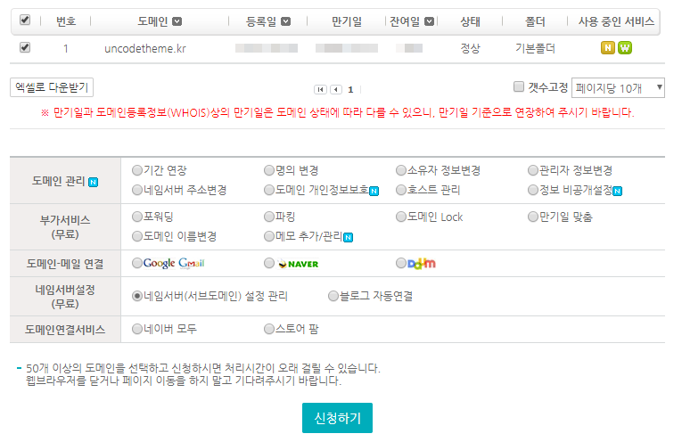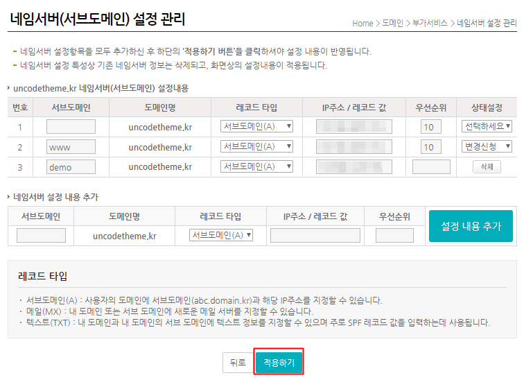 새로운 서브도메인 내용이 추가된 후에는 "적용하기" 버튼을 클릭하여 최종적으로 변경사항을 반영합니다.