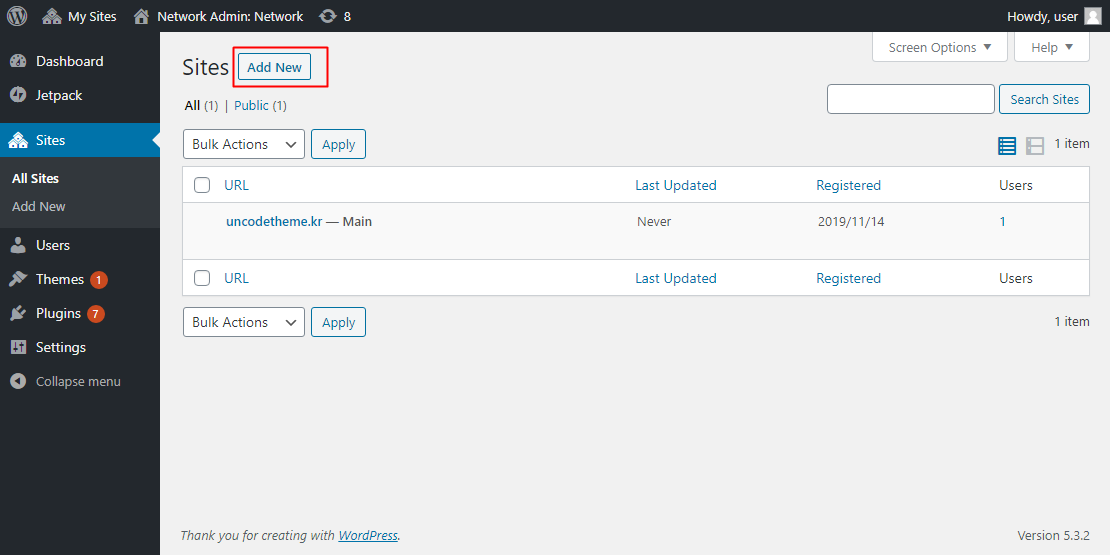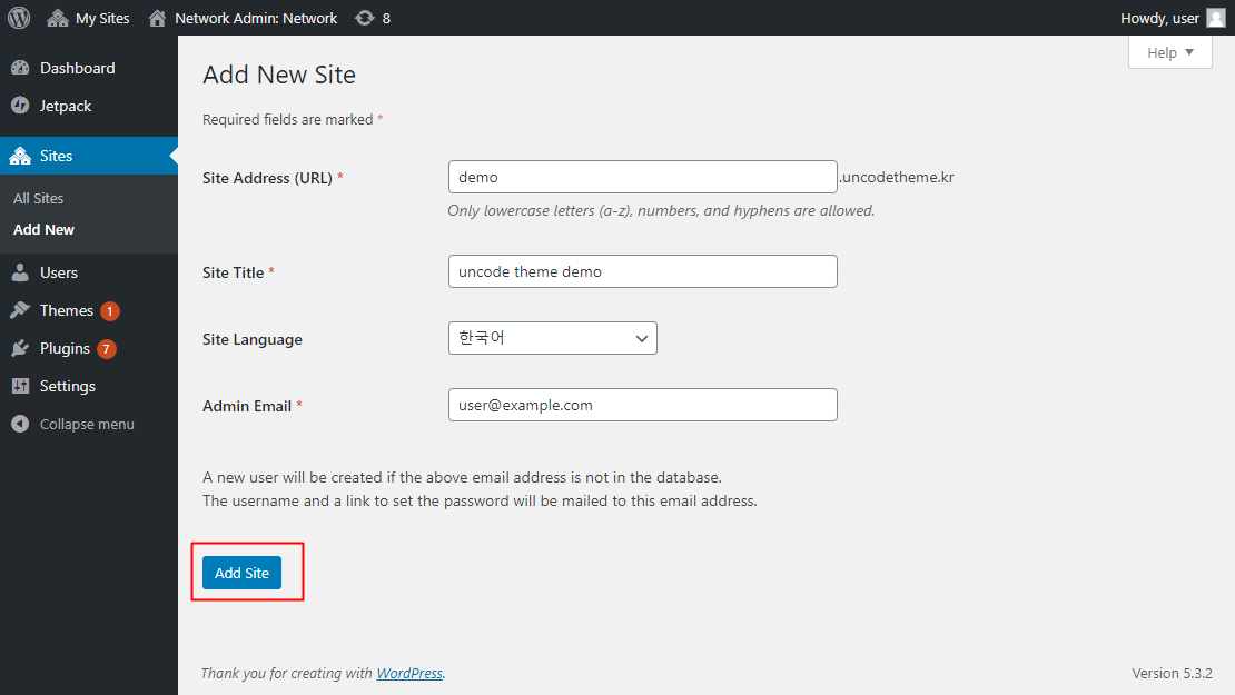 먼저, 워드프레스에 새로 추가할 서브사이트를 설정해 보겠습니다. 새로운 사이트의 주소는 demo.uncodetheme.kr라고 가정합니다.