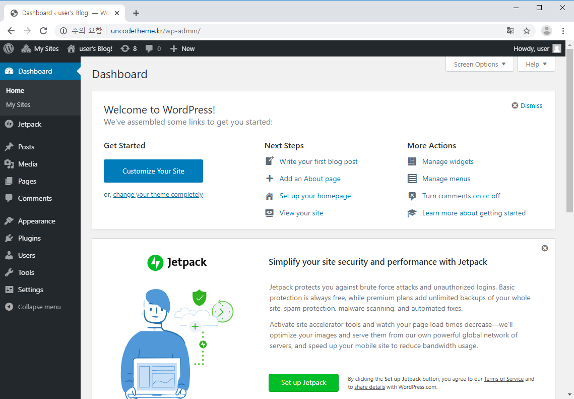 앞에서 설치한 워드프레스 사이트에 관리자 계정으로 로그인을 해볼까요?