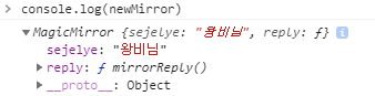 mirrorReply() 함수는 newMirror의 메서드로 호출되므로 3번에서 살펴본 것처럼 함수 내부의 this는 newMirror를 가리키겠죠? 새로 만든 거울에게 묻는다면 newMirror안의 'sejelye'를 찾아서 대답할 것입니다. 고로...