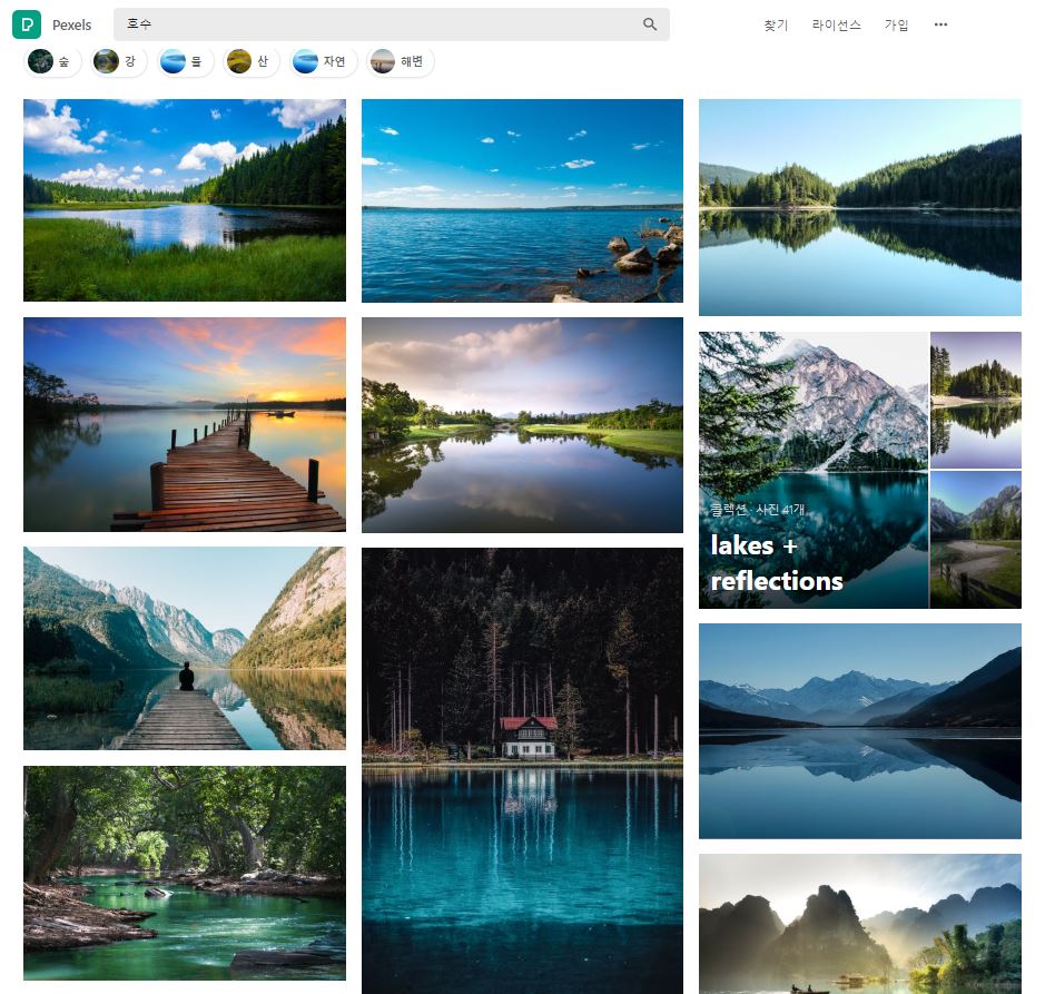 한글 검색이 참 잘 지원되는 것 같습니다. 호수라고 한글로 검색하면 아래와 같이 호수에 대한 이미지가 잘 나오고 연관 검색까지 한글로 잘 뜹니다. 사진 퀄리티도 좋아 보이네요.