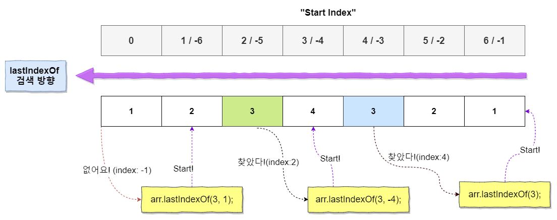 - 시작 인덱스부터 배열의 앞부분으로 거꾸로 검색합니다.(indexOf와의 차이)