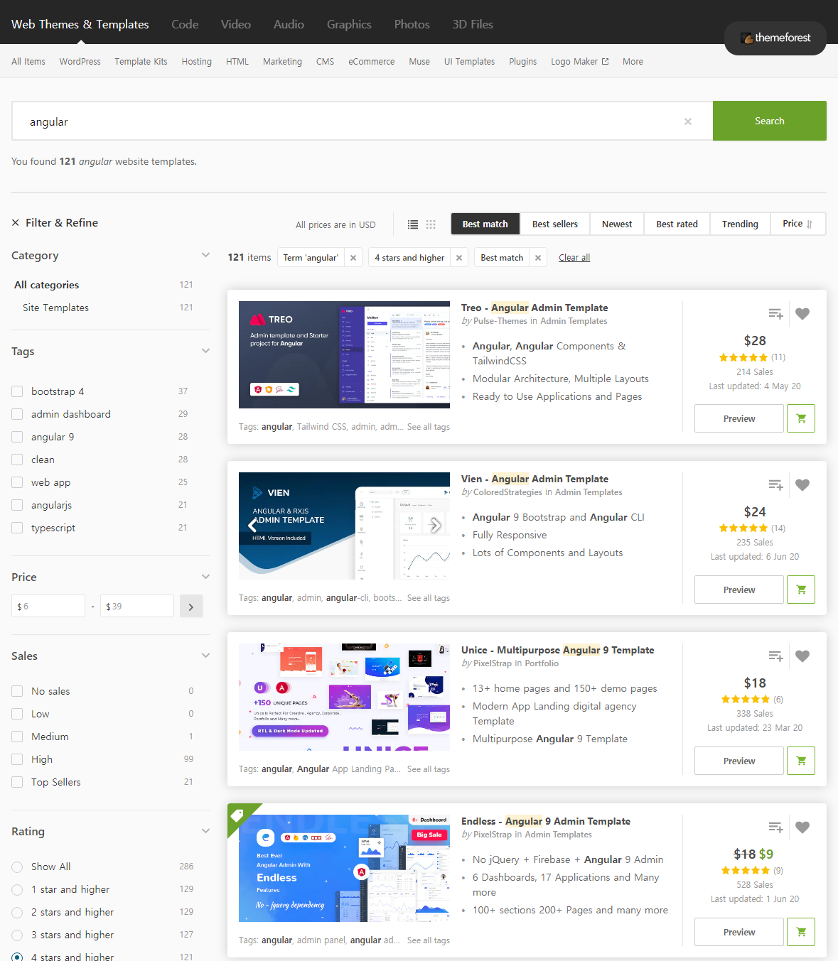 앵귤러로 검색해보면 (https://themeforest.net/search/angular) 꽤 많은 템플릿들이 나타납니다. 주로 대시보드 형태의 템플릿들이 많이 있습니다. 물론, 일반 웹사이트 용도의 템플릿도 있습니다.