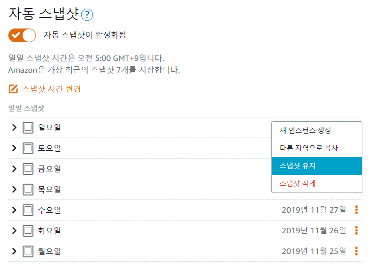 다만, 자동 스냅샷 중에 꼭 필요한 백업이 있다 싶으면 따로 수동 스냅샷으로 보관이 가능하므로 큰 문제는 없습니다.