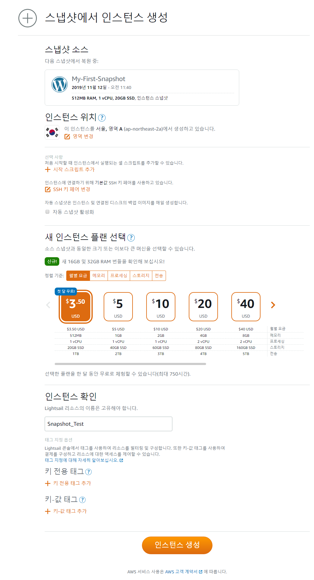 라이트세일의 백업은 사실, 워드프레스와는 아무 상관은 없이 인스턴스 전체에 대한 백업을 받는 것입니다. 즉, OS 영역을 포함한 모든 부분은 백업받는 형태라고 할 수 있습니다. 일단 한번 생성을 해보겠습니다.